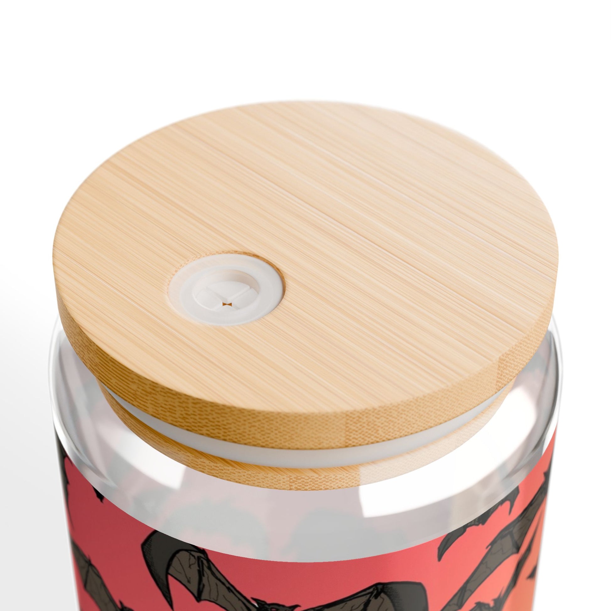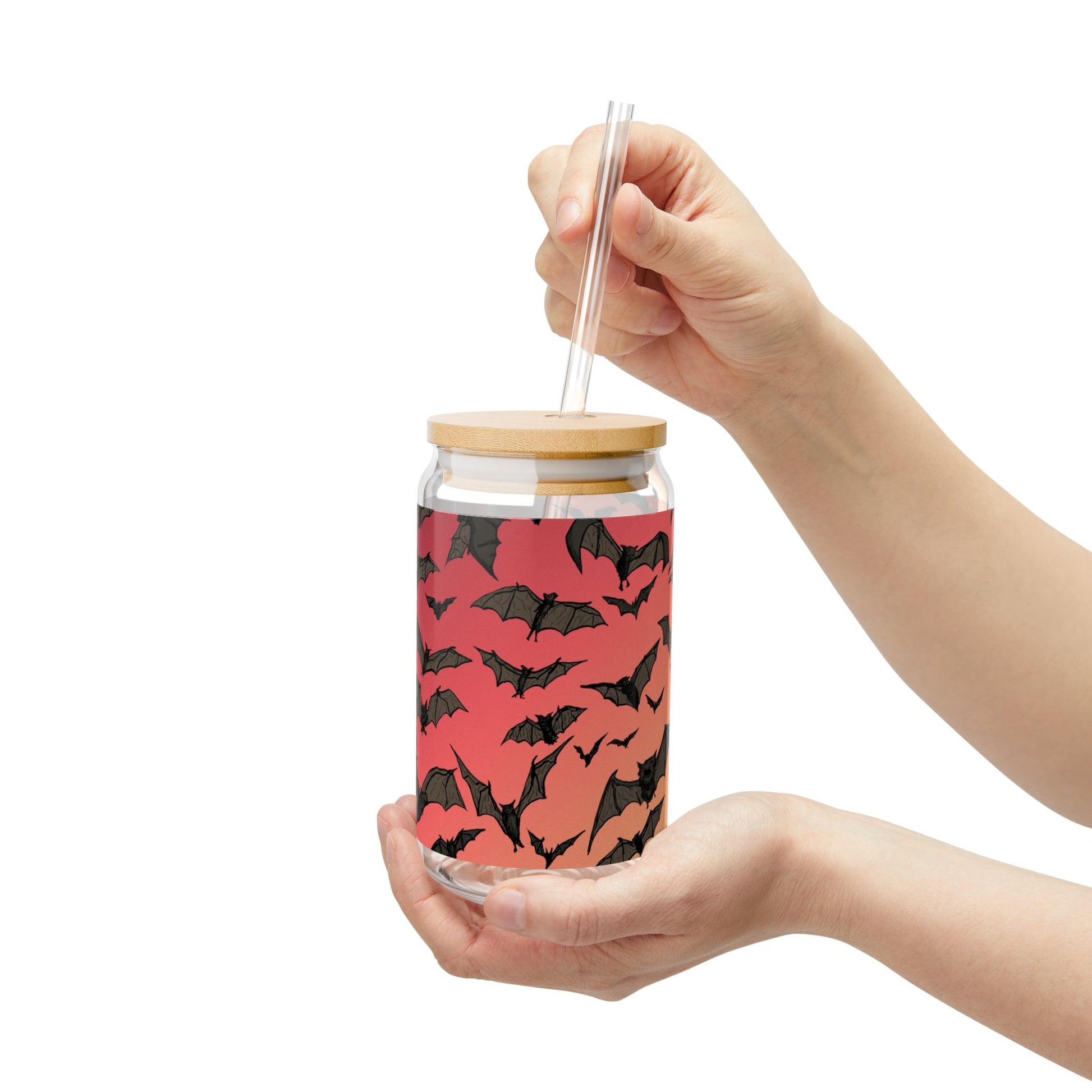 This 16 oz sipper glass brings a playful, slightly eerie vibe to everyday sipping. Clear tempered glass wraps a lively bat pattern against a sunset-red background, giving drinks a bold pop of color while the bamboo lid and clear Tritan straw add a natural, modern touch. Lightweight but sturdy, it sits comfortably on a desk, nightstand, or picnic blanket — great for sipping iced tea, lemonade, or a chilled mocktail while settling into an autumn evening or celebrating spooky season. The design feels like a brief twilight flight: energetic, quirky, and a little mysterious. Hand-wash care keeps the vibrant print lasting and the BPA-free Tritan straw stays clear and durable through many uses.