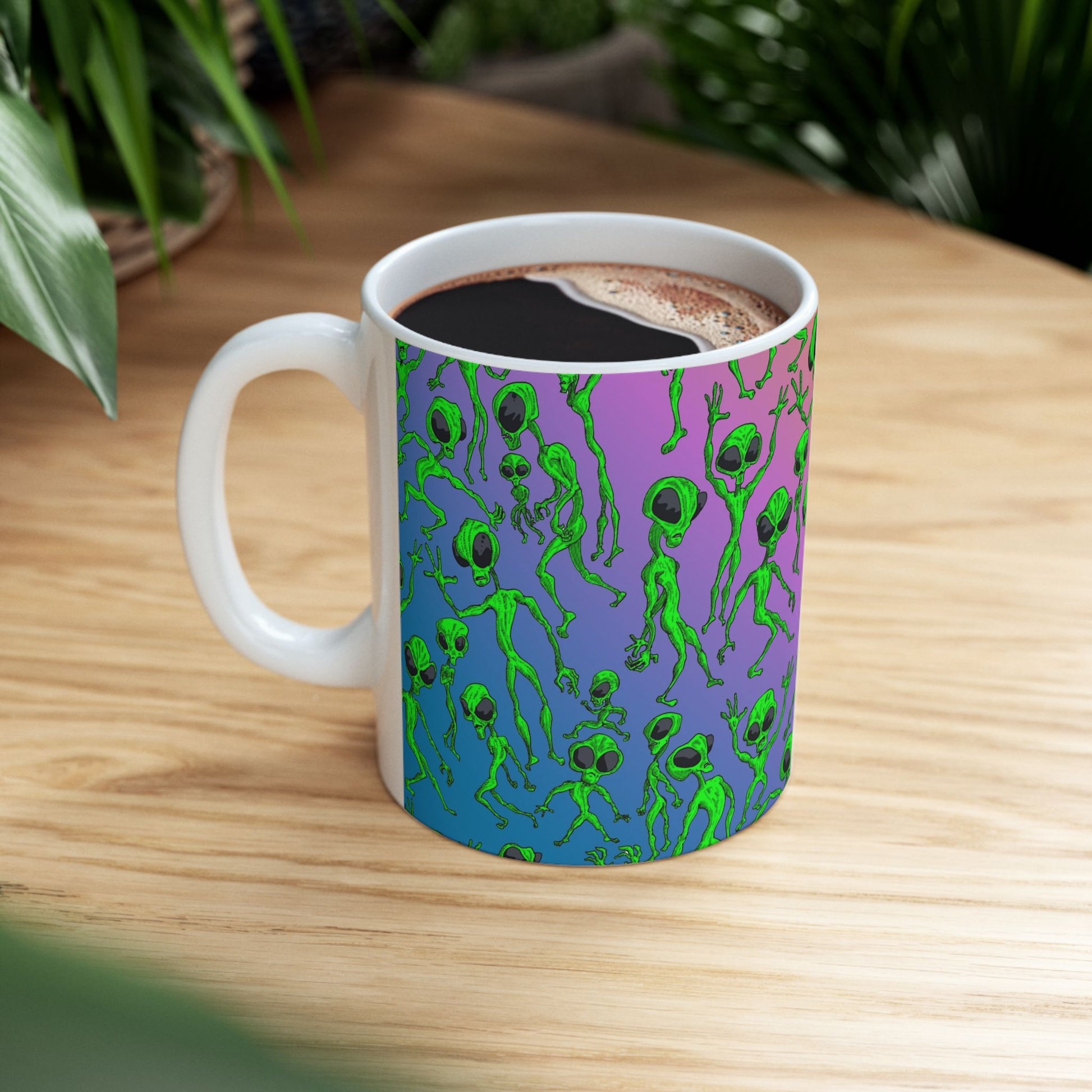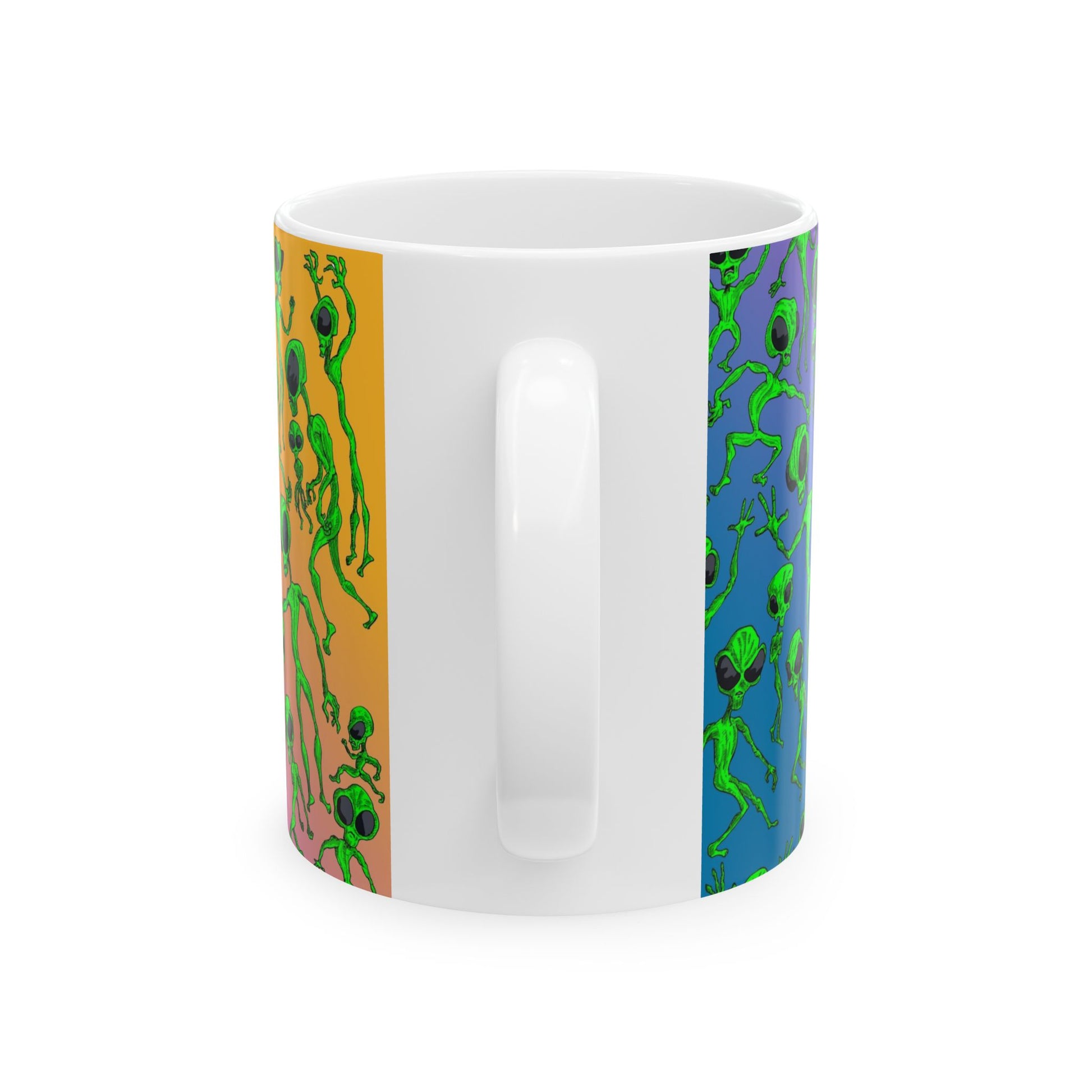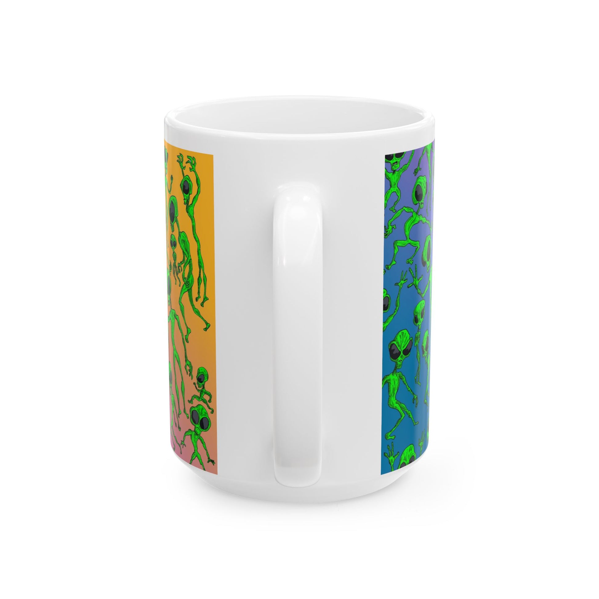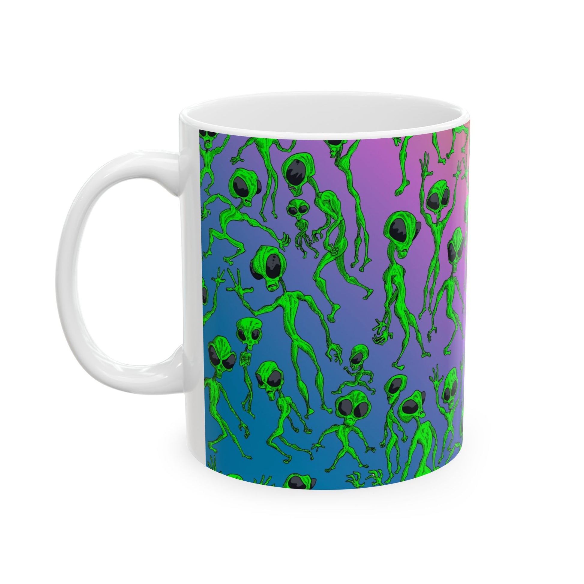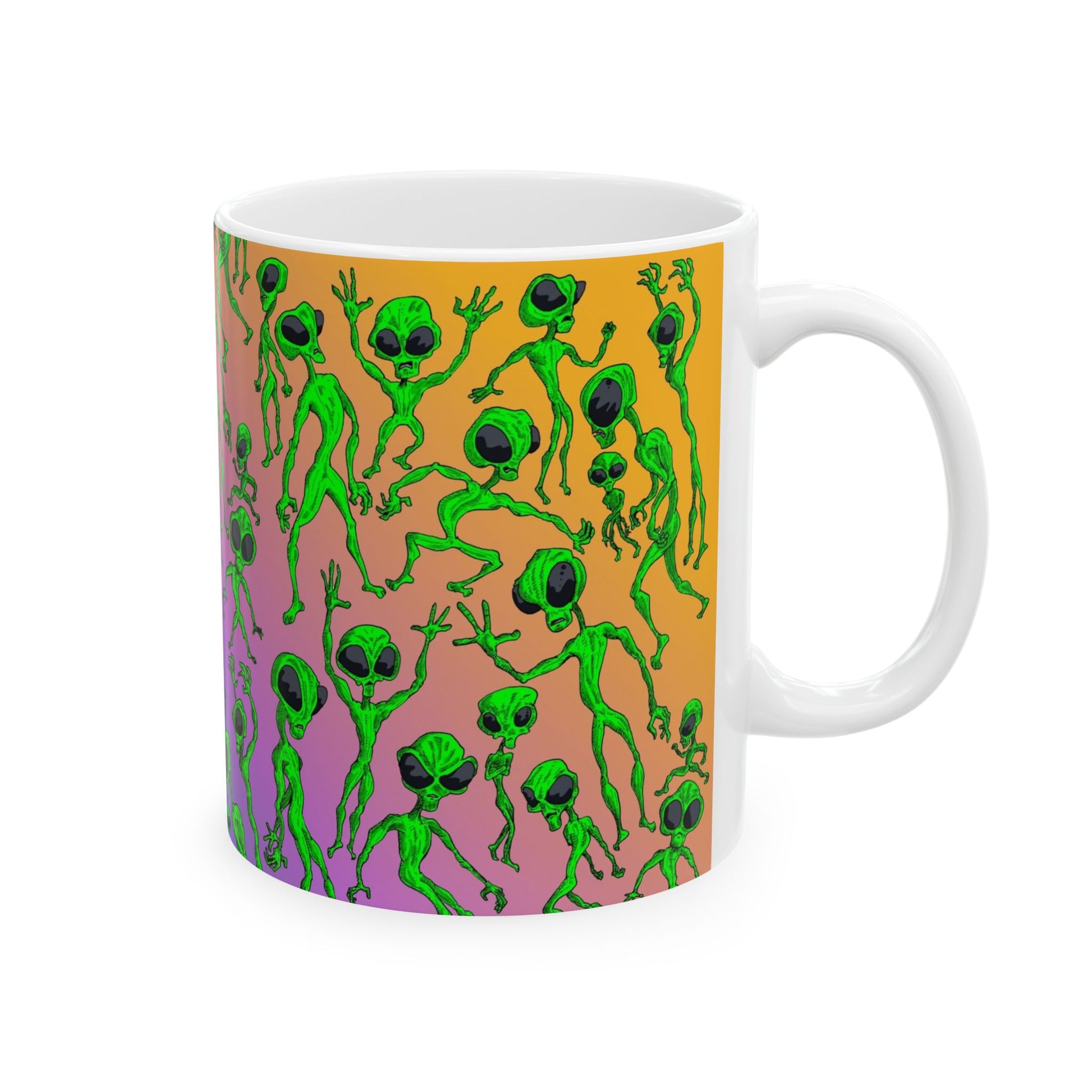 Bright, quirky, and unapologetically fun — this glossy ceramic mug brings a playful alien parade to your everyday coffee ritual. The wraparound print features lively green little extraterrestrials dancing across a vibrant gradient background, so every sip feels a little more adventurous. Lightweight yet sturdy, it slips easily into morning routines and late-night creative sessions alike. The comfortable C-handle and shiny finish make it enjoyable to hold and look at, while dishwasher- and microwave-safe construction keeps life simple. Lead- and BPA-free, it’s built to be used and loved every day.