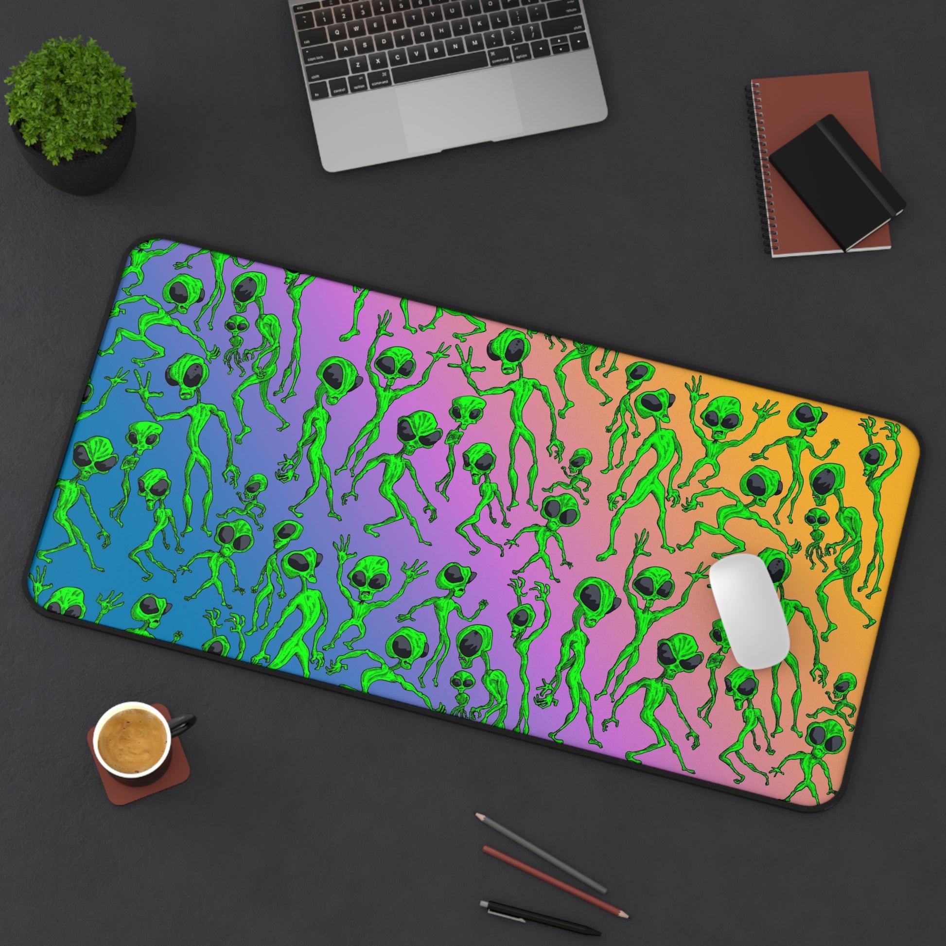 Alien Dance Party Gradient Desk Mat – Colorful Green Alien Pattern Gaming Mousepad
