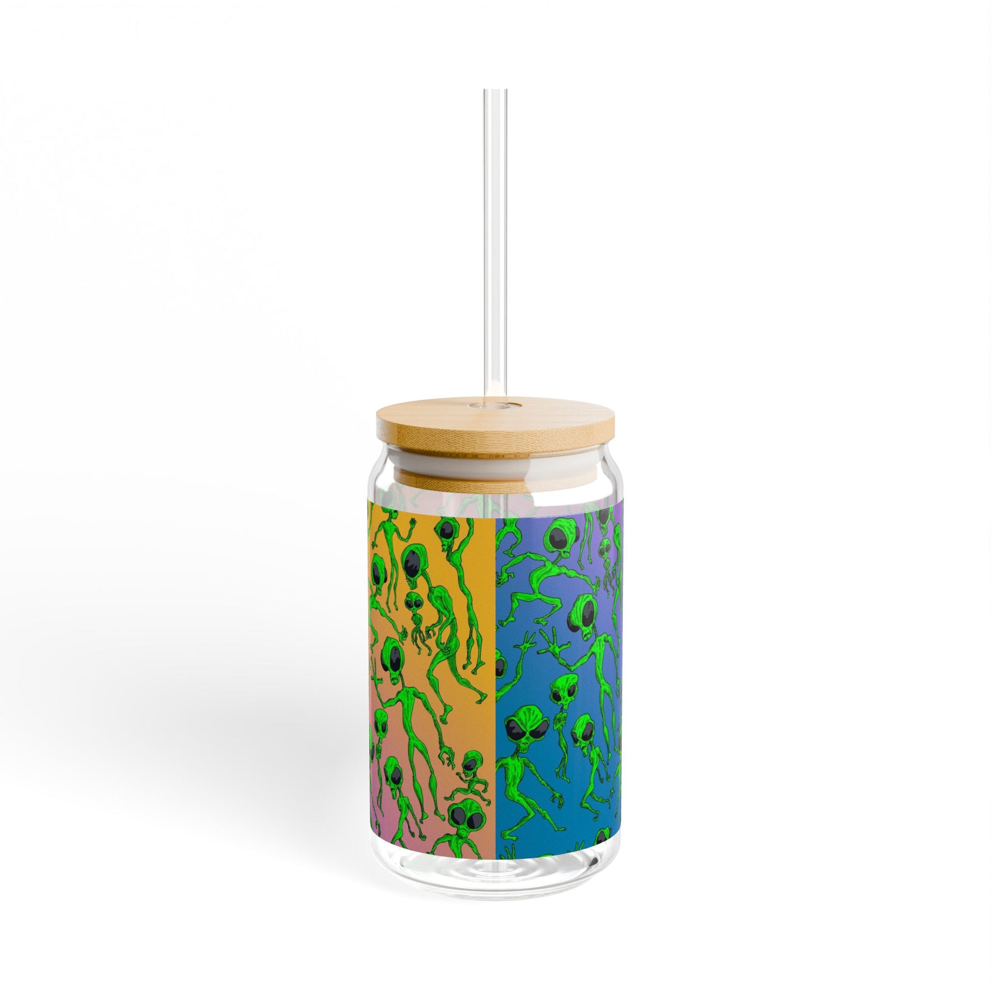 This 16oz sipper glass brings playful, surreal energy to everyday sipping. Clear tempered glass holds your cold (or room-temp) drinks while a bright, all-over print wraps the exterior in dancing, neon-green alien figures on shifting pastel gradients. Choose the bamboo gasket-push lid with a clear Tritan straw for easy sipping on the go, or skip the lid and enjoy the open-top glass. The lightweight, BPA-free Tritan straw resists dents and handles temperature changes, while the sturdy glass body feels crisp in your hand and shows off the artwork from every angle. It’s made in the USA from globally sourced materials and finished for vibrant, long-lasting color—just hand wash to keep it looking its best.
