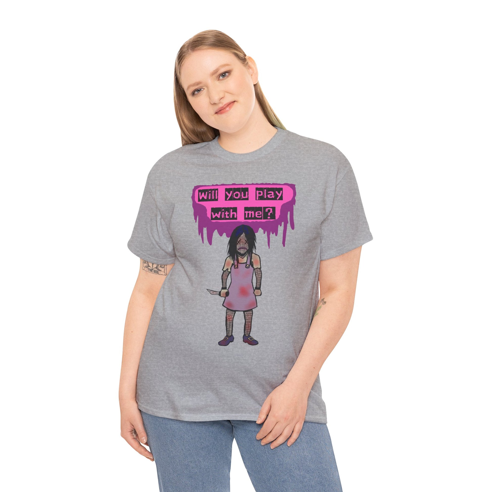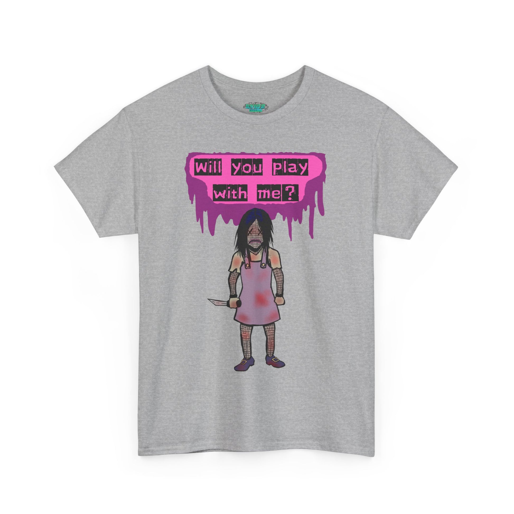 Chilling Evil Doll Horror Tee, Horror T-Shirt, Grey Tee, Unique Graphic Tee, Unisex Tee, Playful Scary Top, Halloween Shirt