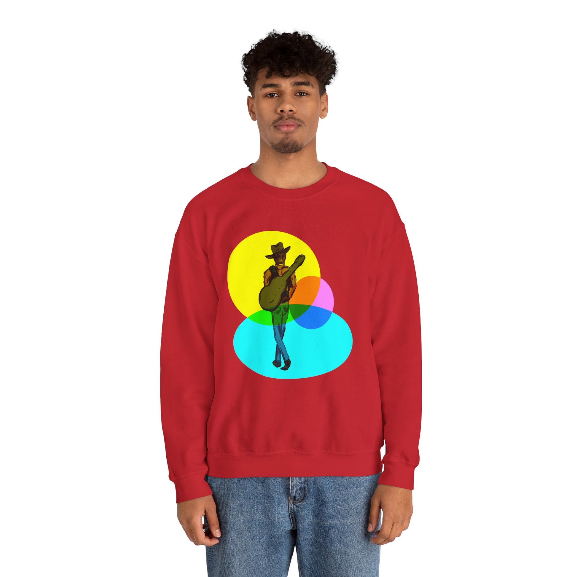 Soft, roomy, and quietly expressive — this crewneck brings a laid-back, singer-on-the-road energy to cool mornings and late-night jam sessions. The artwork sits front-and-center: a silhouetted guitarist in a relaxed pose, layered over luminous overlapping color circles that feel like stage lights or memory halos. Wear it to warm up between sets, throw it on for a coffee run, or curl up with a notebook and chords. The medium-heavy fleece holds shape wash after wash, and subtle details like ribbed collar and double-needle stitching keep it feeling dependable. It’s for people who carry songs in their pockets and prefer clothing that listens as much as it speaks.