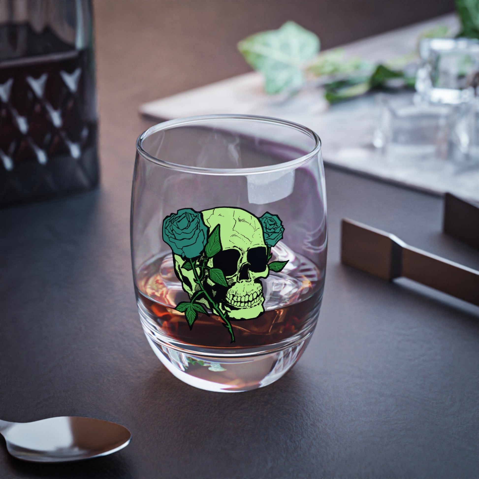 Decorative Skull and Rose(greens) Whiskey Glass - Unique Barware Gift