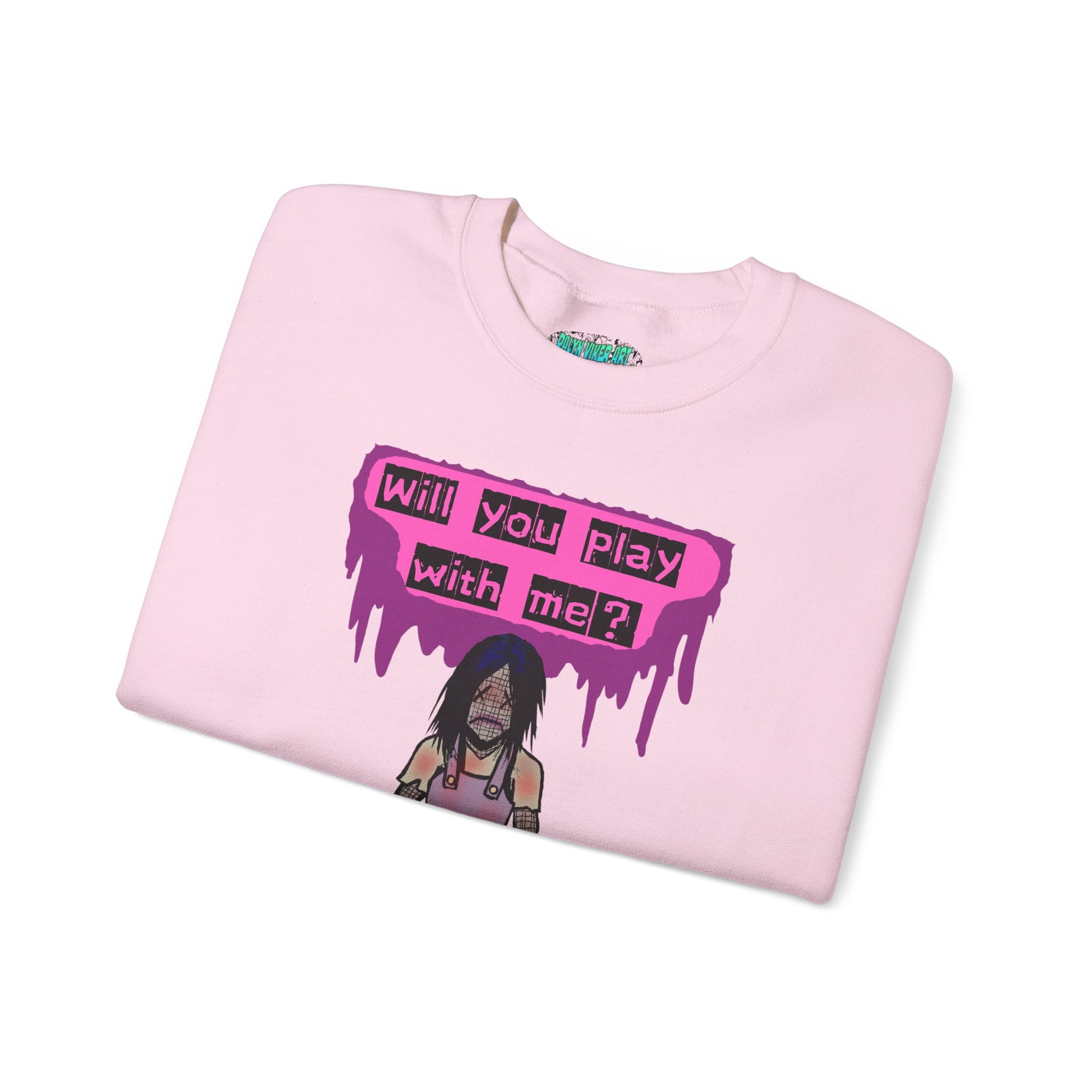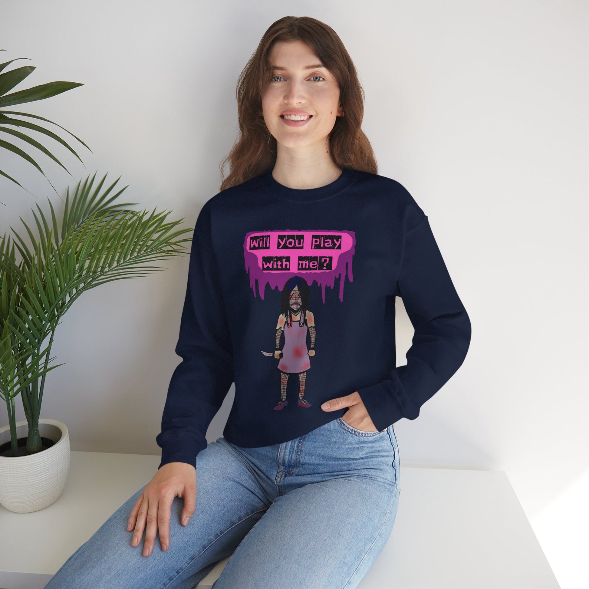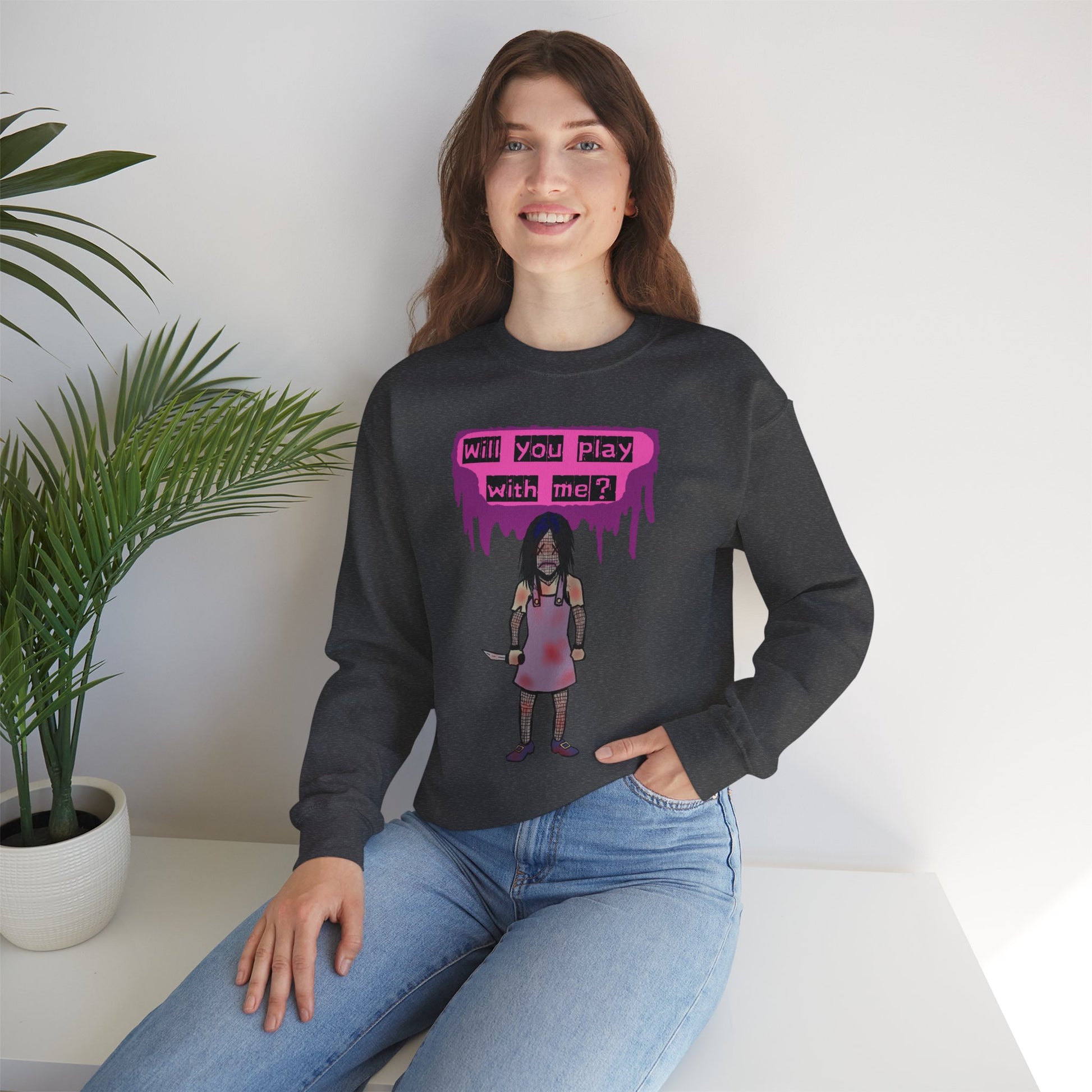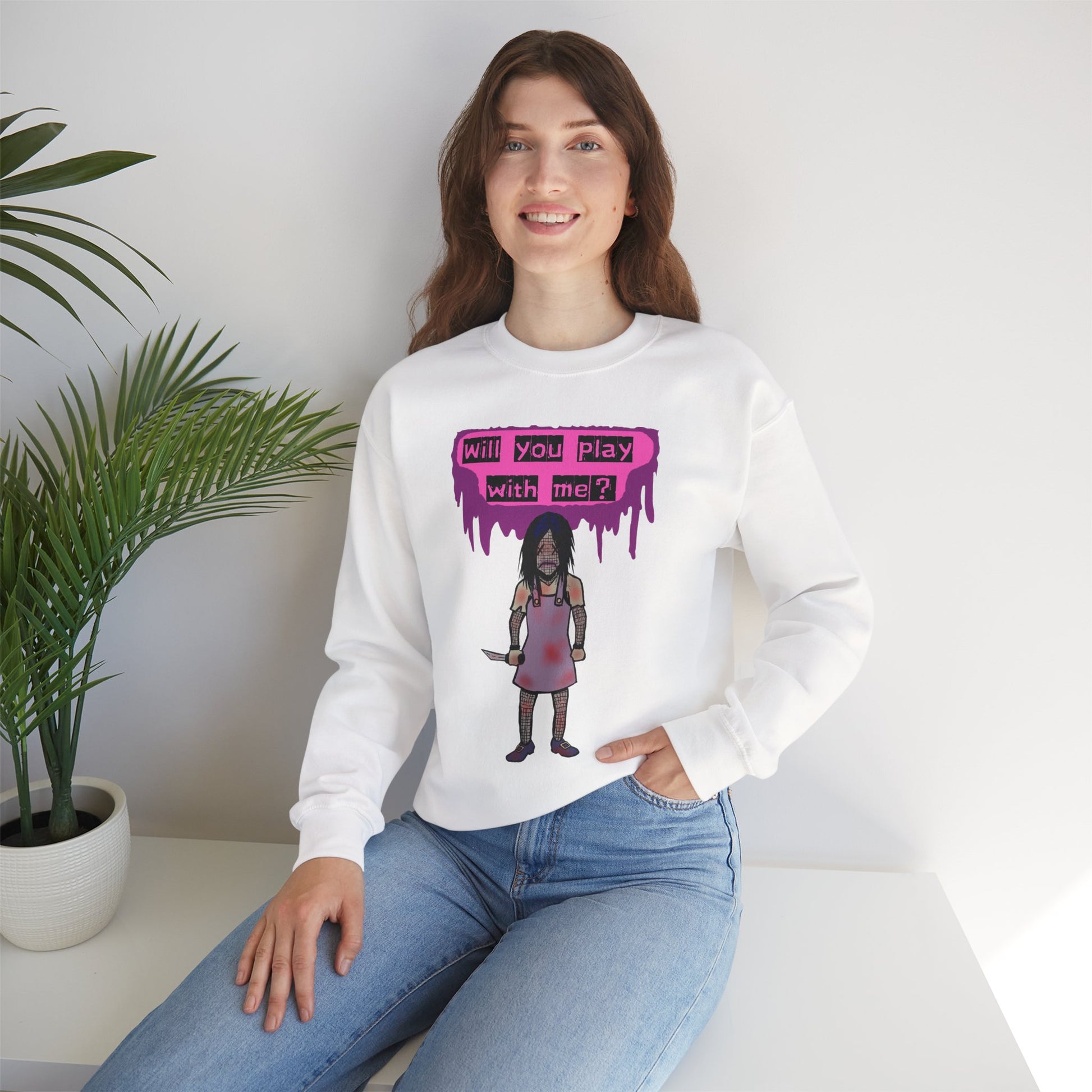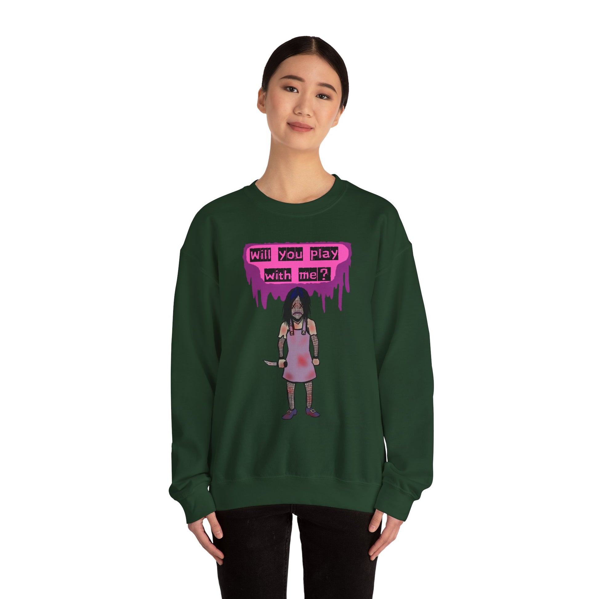 Evil Doll GHOSTLY VINTAGE UNISEX CREWNECK SWEATSHIRT - "Will You Play With Me?"